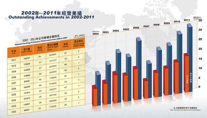 近年來,公司發(fā)展勢(shì)頭良好, 2014年公司實(shí)際出口額達(dá)到10.5億美金,排名“2014中國(guó)出口200強(qiáng)”第192名,其中民營(yíng)企業(yè)排名第21名。公司先后獲得 “中國(guó)守合同重信用企業(yè)”、 “廣東省先進(jìn)集體”、“廣東省優(yōu)秀民營(yíng)企業(yè)”、“東莞市50強(qiáng)民營(yíng)企業(yè)”,“東莞市文明單位”等稱號(hào),公司被東莞市政府授予“東莞市50強(qiáng)民營(yíng)服務(wù)業(yè)企業(yè)”光榮稱號(hào),公司董事長(zhǎng)陳海生被授予“東莞市優(yōu)秀民營(yíng)企業(yè)家”光榮稱號(hào)。